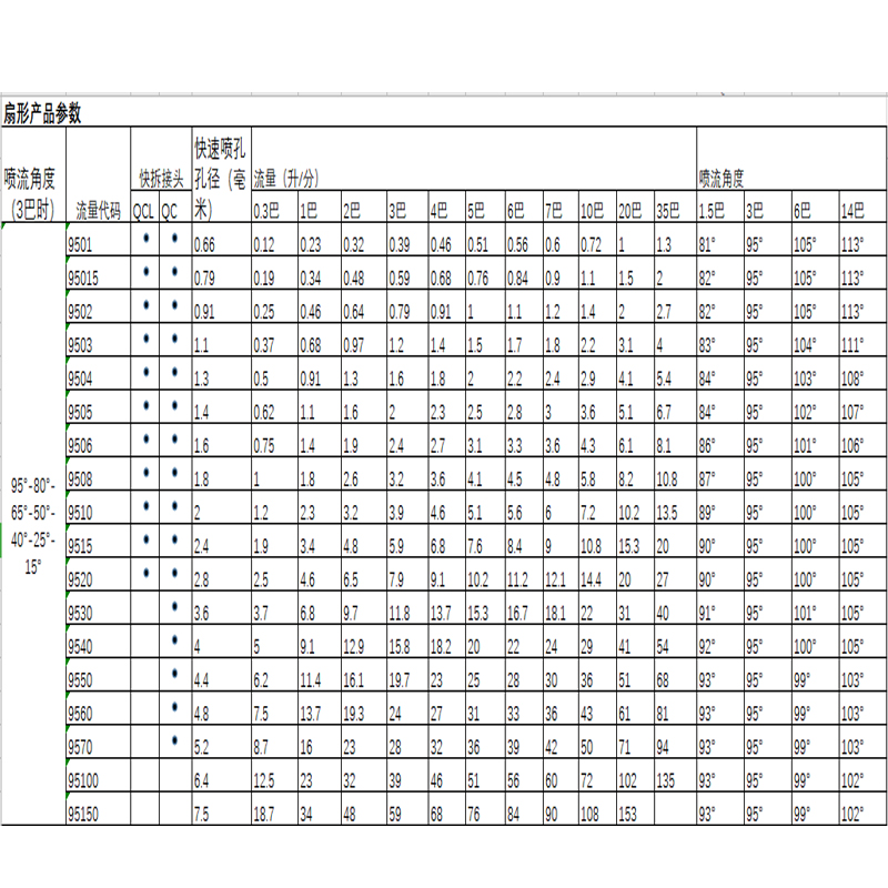 CC扇形噴嘴1、使用時(shí)產(chǎn)生高沖擊力的液流或扇形噴霧,噴霧角度為0-110度。 2、噴霧分布均勻,液滴大小為小到中等。當(dāng)需要若干個(gè)噴嘴產(chǎn)生重疊噴霧時(shí),自動(dòng)逐漸變細(xì)噴霧邊緣,使得噴霧覆蓋