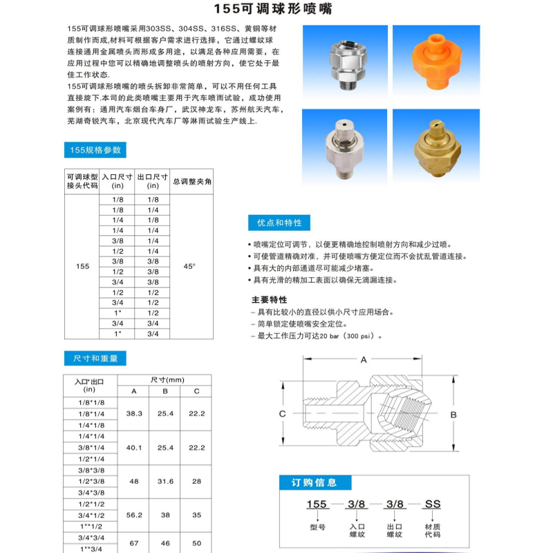 不銹鋼可調(diào)球噴嘴,它通過螺紋球連接通用金屬噴頭而形成多系列用途,以滿足各種應(yīng)用需要,在用的過程中您可以精確地調(diào)整噴頭的噴射方向,使它處于最佳的工作狀態(tài)。可調(diào)節(jié)噴嘴最大承受壓力為21巴,入口連接尺寸有1/81/4   3/8 和1/2英寸等,材料可選:不銹鋼    黃銅
